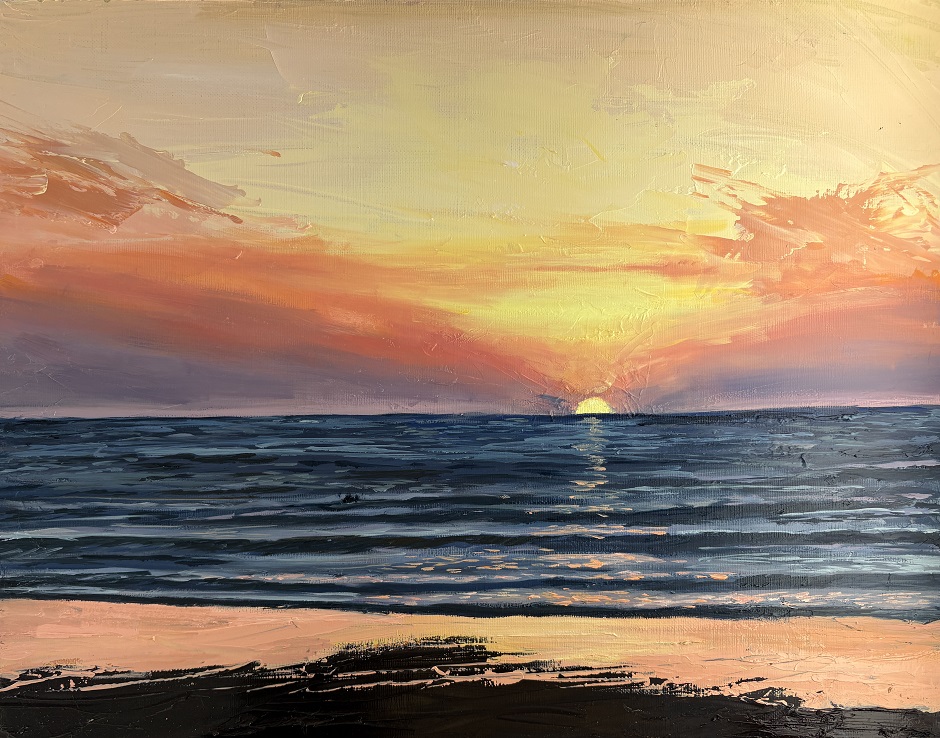 Apricot Sunset III depicts a  14″ x 18″ sized oil  painting completed in 2025  showing a sunset at Ventura Beach, Ventura County, California.  Pallet knife and brush was used to create this painting on a stretched Belgium linen canvas.