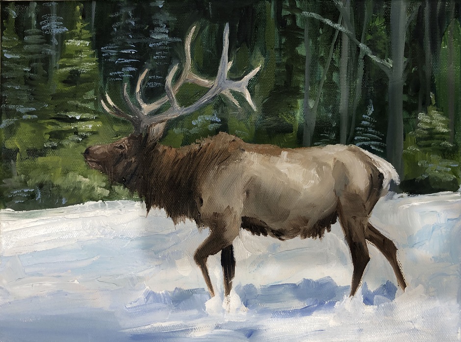 9″ x 12″ oil painting on stretched canvasĀ  of a bull Elk bugling walking in the snow.