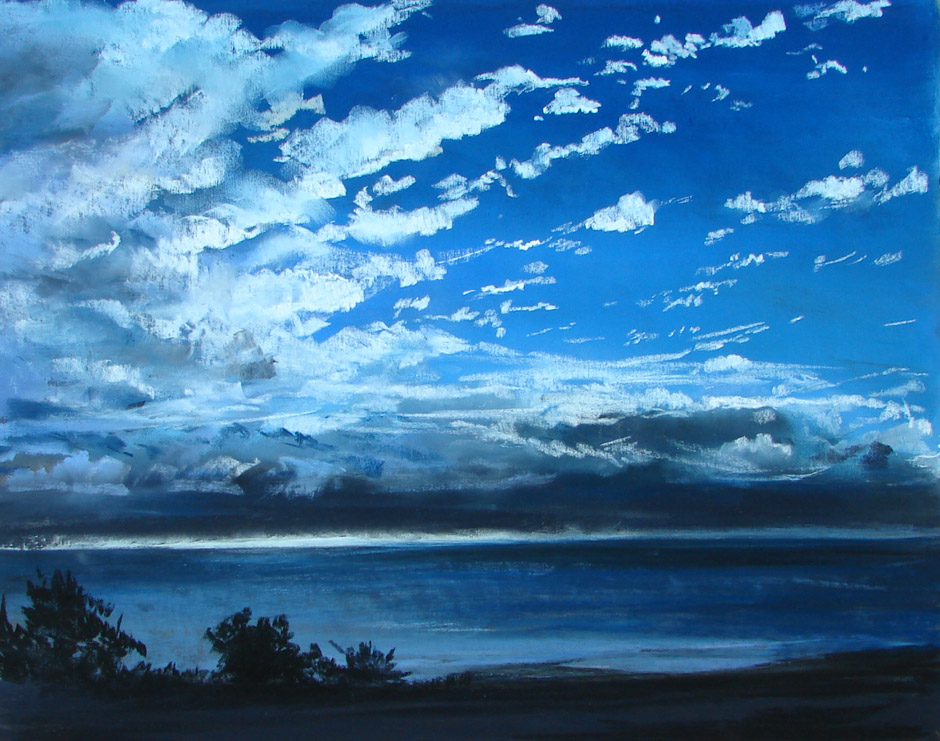 My husband and I were on our way up highway 101 to visit my parents. It was in the evening and the sun was just setting on the horizon. The colors of the sunset were interesting as the were no warm colors. Just a variety of blues and silver clouds.